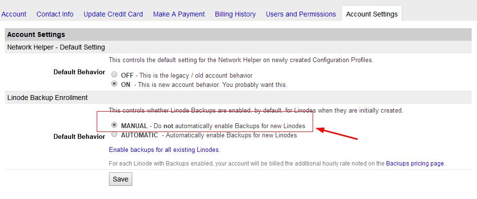Linode Backup Auto-enrollment We recently added an account setting for automatic Linode Backup enrollment. With this setting set to "AUTOMATIC", all new Linodes will be created with the Linode Backup Service enabled. To enable backups on all existing Linodes, use the second link below. This setting defaults to "MANUAL". New Linodes will only be automatically enrolled in the Backup service if you explicitly change the setting to "AUTOMATIC" within your Account Settings. Edit Account Settings (future Linodes) Enable Backups for all Linodes (existing Linodes)
