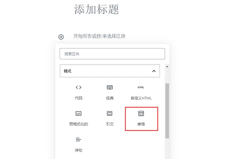 在以前wordpress中创建表格不是那么简单的,要么借助插件,要么懂一点HTML知识,反正相对来说稍微繁琐一些。在古腾堡编辑器出来之后,创建简单的表格也就非常容易了哦,无需插件,无需代码要求,就可以轻松创建表格。只需创建一个新的文章或页面,或编辑一个现有的文章或页面,进入内容编辑器后,单击(+)符号以添加一个新块,然后选择“表格”。如下图所示: