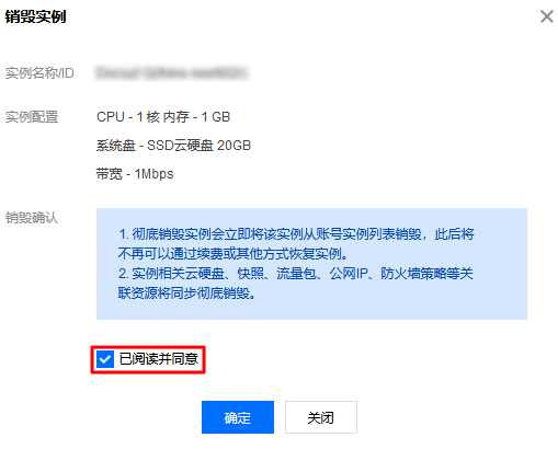 注意:此操作将彻底销毁实例,即从账号的服务器列表销毁实例,此后不可再通过续费或其他方式恢复实例。请谨慎操作!