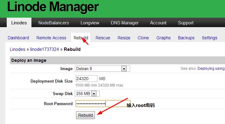 在Image处可以选择自己喜欢的操作系统,在Root Password处填写root密码,其他的默认即可;然后点击”REBUILD”按钮,就可以看到正在安装,大概几分钟就可以。