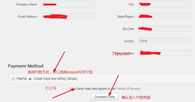 可以看到以上个人资料,这是小七已经登录了自己的个人账号!我们付款首选支付宝,如上图所示,之后选择同意服务条款,点击Complete order完成订单去付款吧!